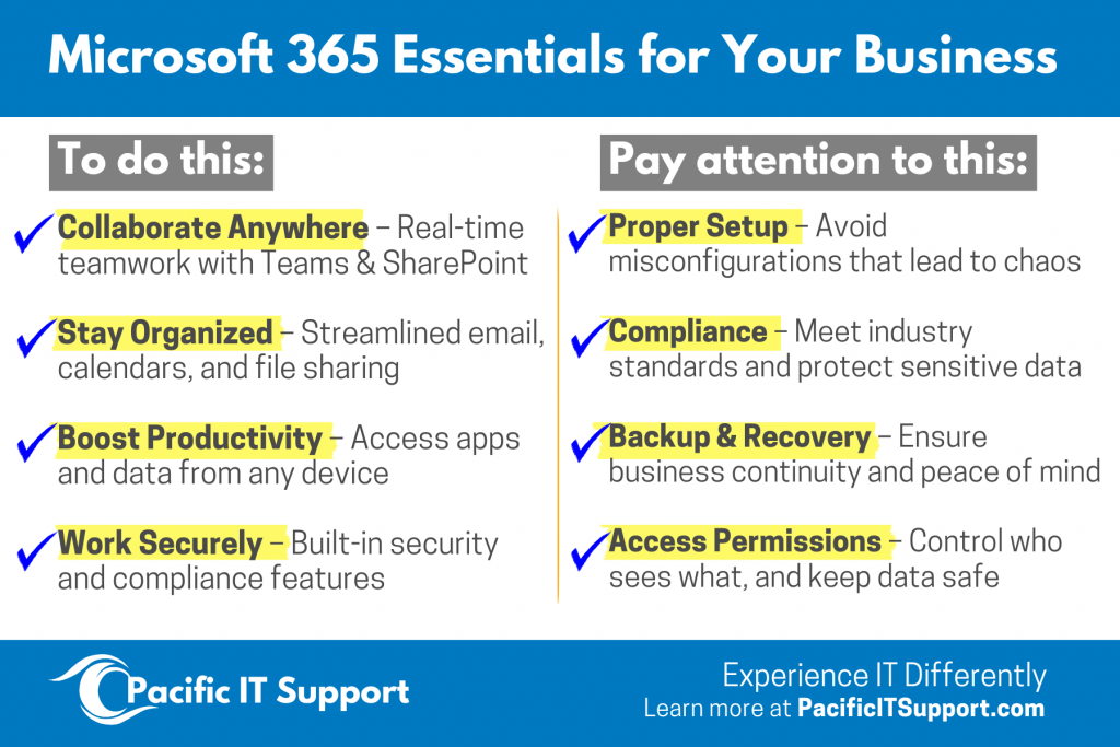 At Pacific IT Support, we’ve helped businesses across Washington, Maui, and beyond—construction firms, healthcare providers, real estate agencies, manufacturers, and nonprofits—get Microsoft 365 set up the right way. Here’s what you need to know.